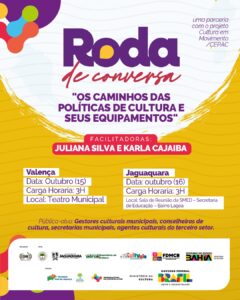 Gestores culturais, conselheiros de cultura e agentes culturais do terceiro setor participam, nos dias 15 e 16 de outubro, da Roda de Conversa “Os Caminhos das Políticas de Cultura e Seus Equipamentos”, que será realizada nas cidades de Valença e Jaguaquara, respectivamente.