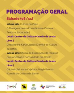 No sábado (8), a programação segue com o encontro “Cultura no Pano – O Diálogo Através do Vestir entre Cinema, Teatro e Sociedade”, mediado por Karla Cajaíba, e a oficina de elaboração de projetos para artesãos e comunidade em geral, com Karla Cajaíba e Nagib Barroso.