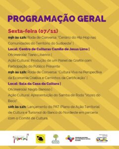 Entre os destaques da programação, estão a roda de conversa “Cenário do Hip Hop nas Comunidades do Território do Sudoeste”, com o oficineiro Tiano Libarino, e o painel de grafite com participação do público. Também será realizado o diálogo “Cultura Viva na Perspectiva da Economia Criativa e Caminhos da Certificação”, conduzido por Nagib Barroso, e o lançamento do Plano de Ação Territorial (PAT) de Cultura e Turismo do Banco do Nordeste, em parceria com o Comitê de Cultura.