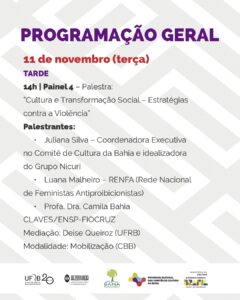 Na terça-feira (11), terá o Painel 4 – Palestra sobre “Cultura e Transformação Social – Estratégias contra a Violência”, com início previsto para as 14h. O painel reunirá um time de especialistas para discutir a temática em profundidade: Juliana Silva, Coordenadora Executiva no Comitê de Cultura da Bahia e idealizadora do Grupo Nicuri; Luana Malheiro, da RENFA (Rede Nacional de Feministas Antiproibicionistas); e a Profa. Dra. Camila Bahia, da CLAVES/ENSP-FIOCRUZ. A mediação ficará a cargo de Deise Queiroz (UFRB), e o encontro será realizado na modalidade Mobilização (CBB), reforçando o caráter de engajamento e ação do evento.