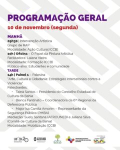 Durante a tarde, o Painel 1 reúne Tainá Santos (presidente do Conselho Estadual de Cultura da Bahia), Bianca Fantinato (coordenadora da 6ª Regional da Defensoria Pública) e Major Isa Camila Amorim (representante da Segurança Pública da Bahia), com mediação de Suely Santana (AFROUNEB) e Juliana Silva (Comitê de Cultura da Bahia). O debate pretende discutir ações conjuntas entre diferentes setores para o enfrentamento da violência, a valorização da cultura e a promoção da cidadania.