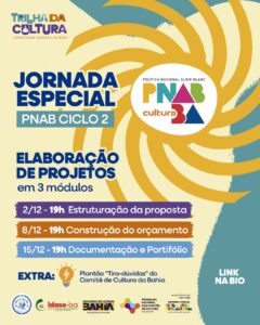 A Jornada Especial de Elaboração de Projetos da PNAB – Ciclo 2 é uma ação integrada do Programa Nacional dos Comitês de Cultura (PNCC Bahia), realizada por meio do projeto Trilha da Cultura e do Comitê de Cultura da Bahia. A iniciativa tem como objetivo fortalecer a participação de fazedoras e fazedores de cultura na Política Nacional Aldir Blanc, ampliando o acesso à informação, à formação técnica e ao acompanhamento direto durante o processo de inscrição.