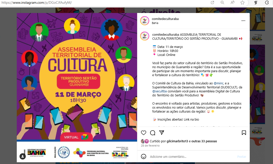 No dia 11 de março de 2025, foi realizada a Assembleia Territorial de Cultura do Território de Guanambi, em formato virtual, com duração de três horas no período noturno. A atividade teve como objetivo central a mobilização e articulação dos agentes culturais da Região Intermediária de Guanambi para o diagnóstico participativo da situação cultural local. A ação promoveu o mapeamento e a integração dos atores culturais, instâncias municipais, Conselhos de Cultura e Câmara Técnica do Sertão Produtivo, fomentando a escuta ativa e o planejamento estratégico para a construção da Caravana Cultural regional. A Assembleia também teve como finalidade divulgar e fortalecer a compreensão da Lei Estadual Cultura Viva da Bahia, ampliando o acesso às políticas públicas culturais e fortalecendo os mecanismos de participação social e o diálogo entre agentes culturais, instituições governamentais e sociedade civil.